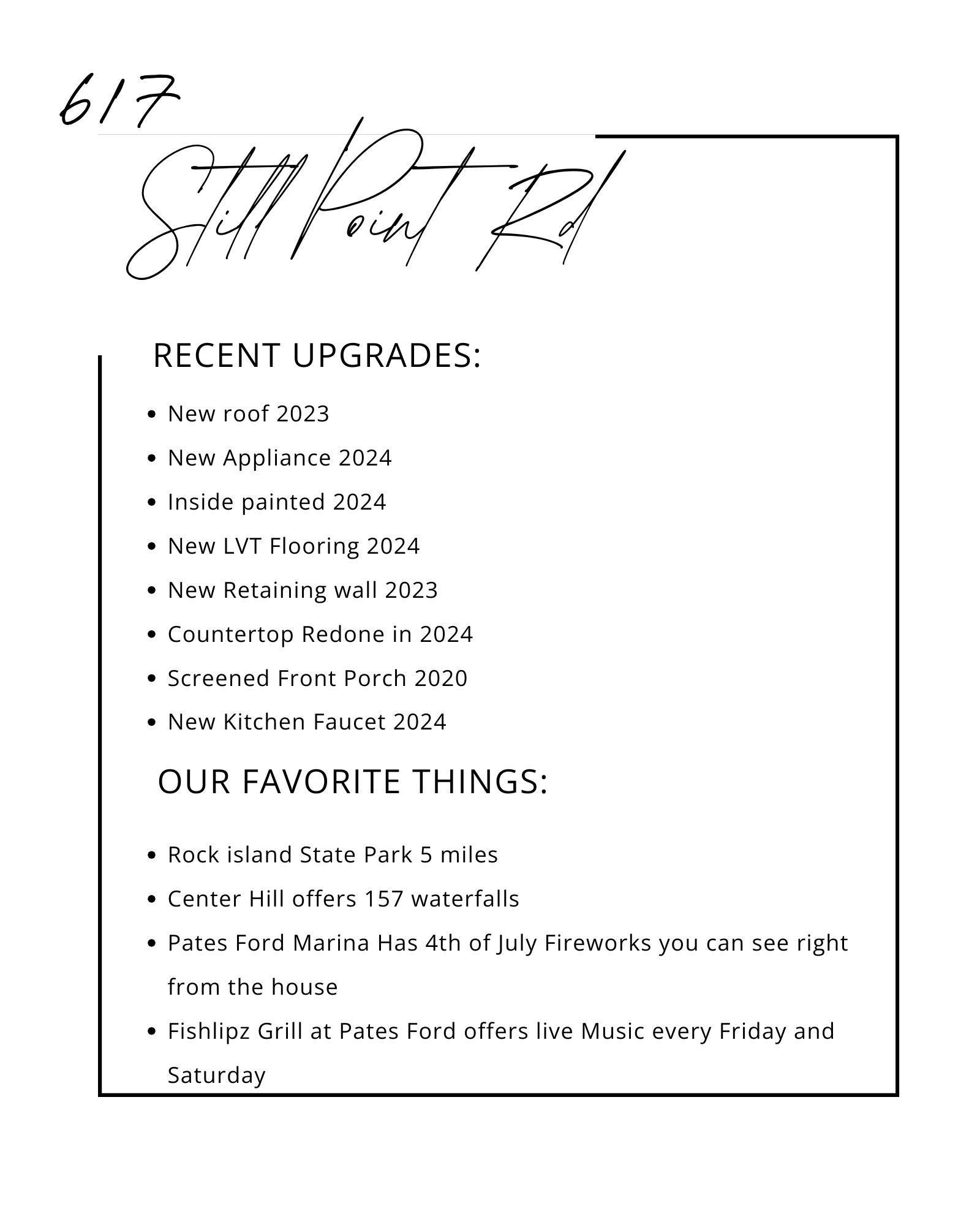 Discover your peaceful retreat just steps from Center Hill Lake! This inviting 2-bedroom, 2-bath cottage offers a blend of charm and modern comfort. This home features two amazing views…off the back is a private wooded retreat with gorgeous hardwoods and sweeping views of wooded vista or the front porch with a lake view to Pates Ford Marina. This cottage has a beautiful kitchen, generous outdoor living space, (two large screened in porches perfect for entertaining) and detached garage for added convenience. This property offers an abundance of parking for your boat and toys. Whether you're seeking a relaxing getaway or a low-maintenance lake community investment (STR eligible), this cottage comes mostly furnished—ready for you to settle in and start enjoying right away. Experience the tranquil sounds of nature from your own private bridge and screened in room that spans a scenic cave and creek. A boat ramp is located inside the neighborhood and provides easy access to launch your boat, jet ski, wave runner or personal water craft. Nestled just across the water from Pates Ford Marina and Fishlipz Grill. Pates Ford is the best marina on Center Hill Lake. Fishlipz Grill offers live music in the summer months, the largest 4th of July fireworks show on the lake and host the most famous event of the summer, Wakefest. The proximity to Pates Ford Marina sets the perfect stage for lake days, dining, and weekend getaways. Whether you're seeking a cozy escape or a nature lover's paradise, this one-of-a-kind property delivers.